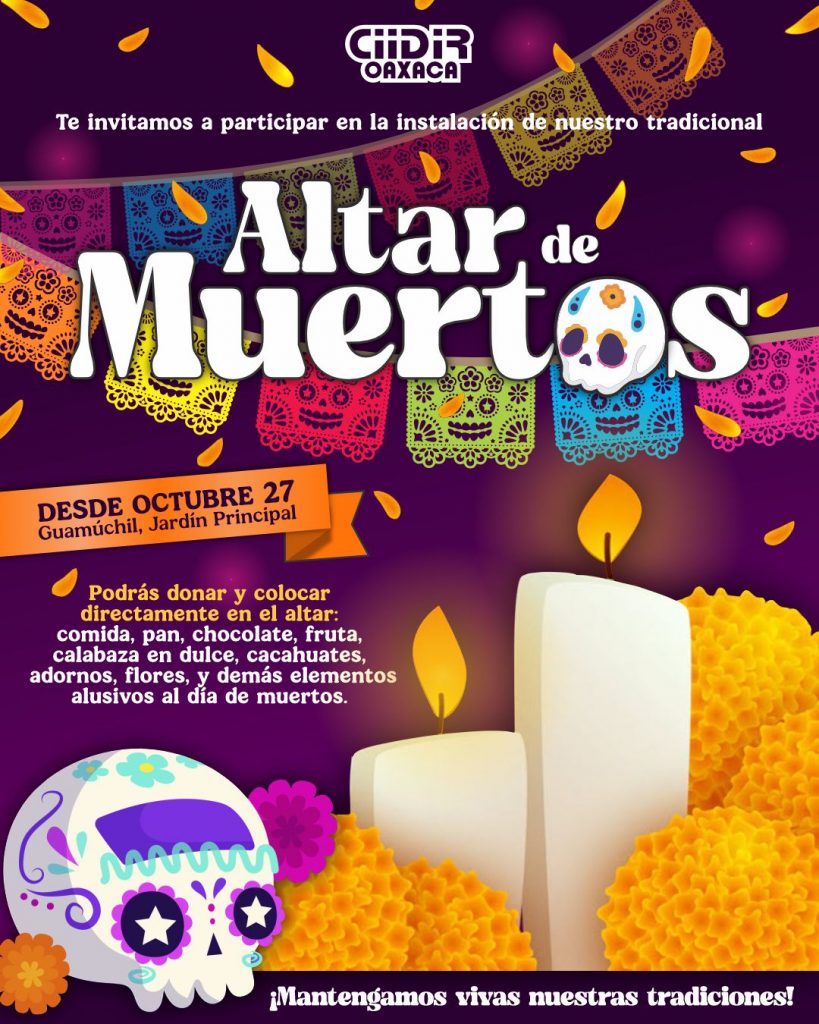 En esta ocasión, el altar se instalará al pie del Guamúchil del jardín principal, a partir de las 8:00 h del lunes 29 de octubre, a fin de que directamente participen en la decoración y colocación de tus aportaciones.