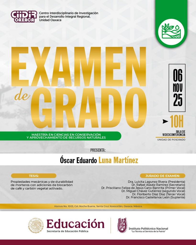 El CIIDIR Unidad Oaxaca, hace una extensa invitación al examen de grado de Óscar Eduardo Luna Martínez, estudiante de la Maestría en Ciencias en Conservación y Aprovechamiento de Recursos Naturales.