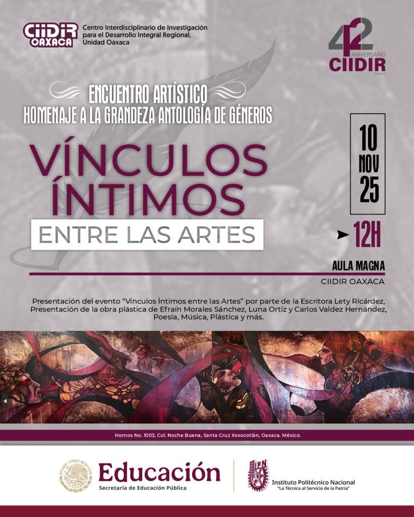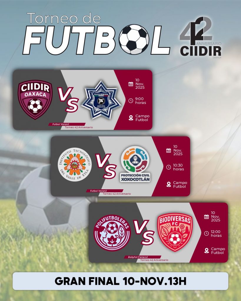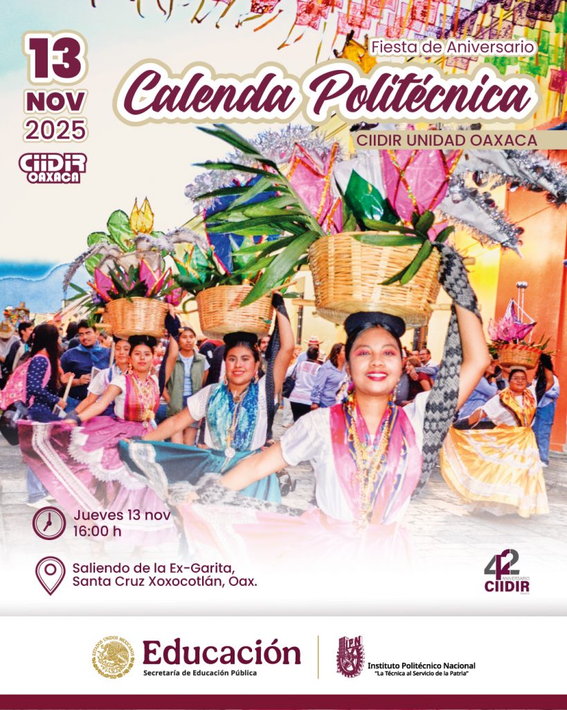 Te compartimos las actividades que tendremos durante la semana del 42 Aniversario del CIIDIR Oaxaca del 10 al 14 de noviembre, esperamos contar con tu presencia y disfrutes de la ciencia, arte, cultura y deportes.