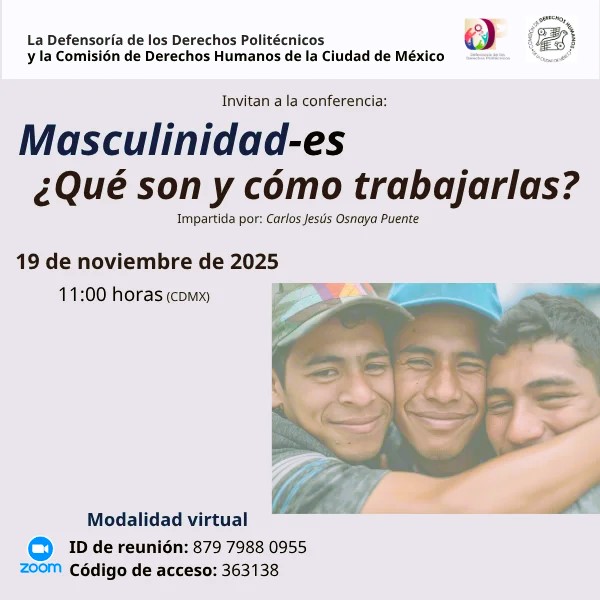 Cordialmente invitados a la conferencia «Masculinidad-es ¿Qué son y cómo trabajarlas?» la cual se llevará a cabo el próximo miércoles, 19 de noviembre, 11:00 hrs (CdMx), vía remota, organizada por la Defensoría de los Derechos Politécnicos (DDP) del IPN en conjunto con la Comisión de Derechos Humanos de la CdMx.