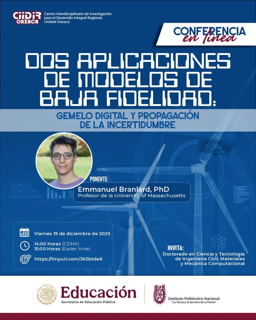 El cuerpo académico del Doctorado en Ciencia y Tecnología de Ingeniería Civil, Materiales y Mecánica Computacional del CIIDIR Oaxaca, invita a todos los interesados a presenciar la conferencia en linea «𝗗𝗼𝘀 𝗮𝗽𝗹𝗶𝗰𝗮𝗰𝗶𝗼𝗻𝗲𝘀 𝗱𝗲 𝗺𝗼𝗱𝗲𝗹𝗼𝘀 𝗱𝗲 𝗯𝗮𝗷𝗮 𝗳𝗶𝗱𝗲𝗹𝗶𝗱𝗮𝗱: 𝗴𝗲𝗺𝗲𝗹𝗼 𝗱𝗶𝗴𝗶𝘁𝗮𝗹 𝘆 𝗽𝗿𝗼𝗽𝗮𝗴𝗮𝗰𝗶𝗼́𝗻 𝗱𝗲 𝗹𝗮 𝗶𝗻𝗰𝗲𝗿𝘁𝗶𝗱𝘂𝗺𝗯𝗿𝗲» la cual será impartida por Emmanuel Branlard, PhD, Profesor de la University of Massachusetts.