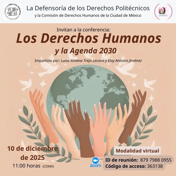 Cordialmente invitados a la conferencia «Los Derechos Humanos y la Agenda 2030» la cual se llevará a cabo el próximo miércoles, 10 de diciembre, 11:00 hrs (CdMx), vía remota, organizada por la Defensoría de los Derechos Politécnicos (DDP) del IPN en conjunto con la Comisión de Derechos Humanos de la CdMx.