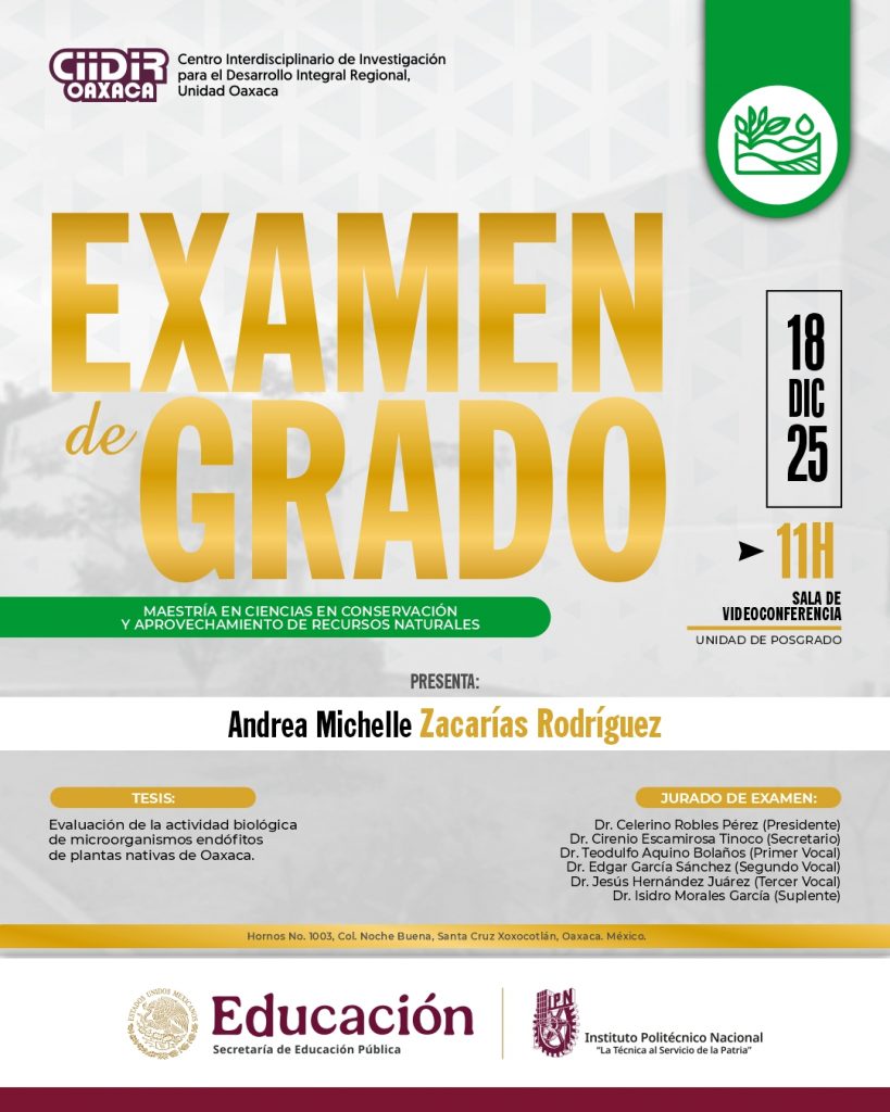 El CIIDIR Unidad Oaxaca, hace una extensa invitación al examen de grado de Andrea Michelle Zacarías Rodríguez, estudiante de la Maestría en Ciencias en Conservación y Aprovechamiento de Recursos Naturales.