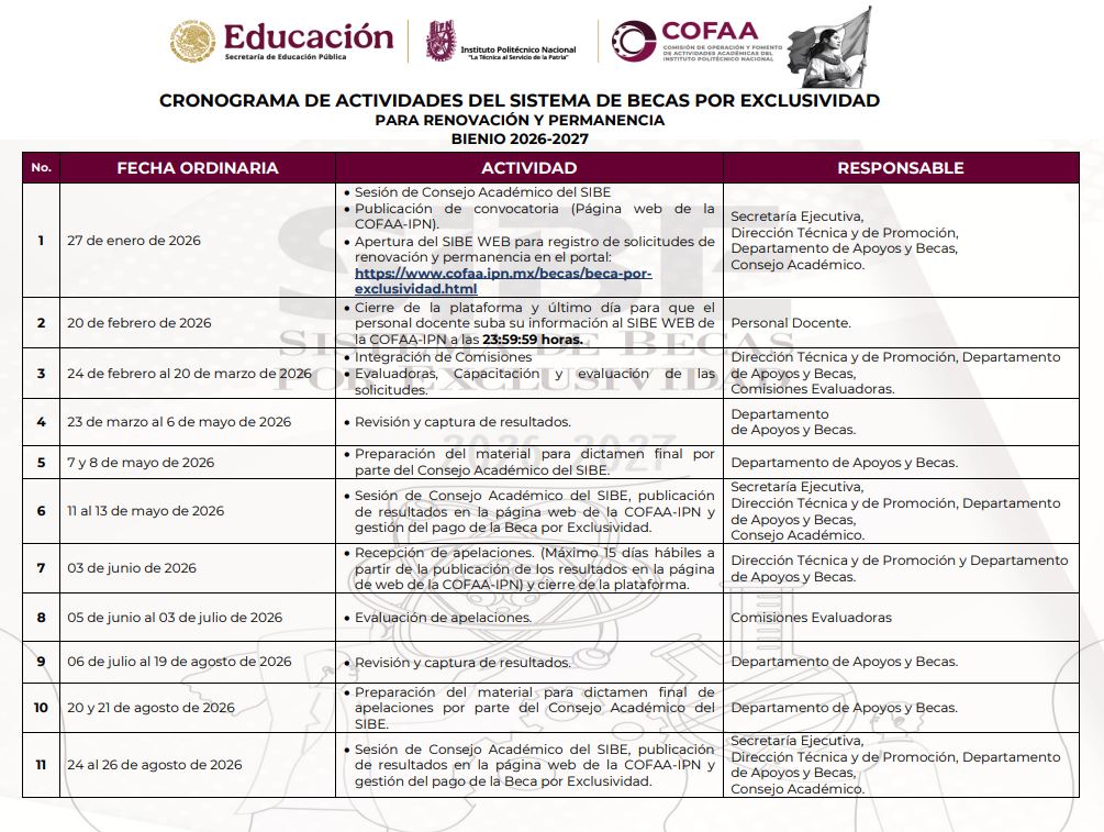 LA COMISIÓN DE OPERACIÓN Y FOMENTO DE ACTIVIDADES ACADÉMICAS DEL INSTITUTO POLITÉCNICO NACIONAL, CON FUNDAMENTO EN LO ESTIPULADO EN EL ARTÍCULO 19, FRACCIÓN I DEL REGLAMENTO DEL SISTEMA DE BECAS POR EXCLUSIVIDAD, CONVOCA AL PERSONAL DOCENTE A PARTICIPAR EN EL SISTEMA DE BECAS POR EXCLUSIVIDAD (SIBE) BIENIO 2026-2027.