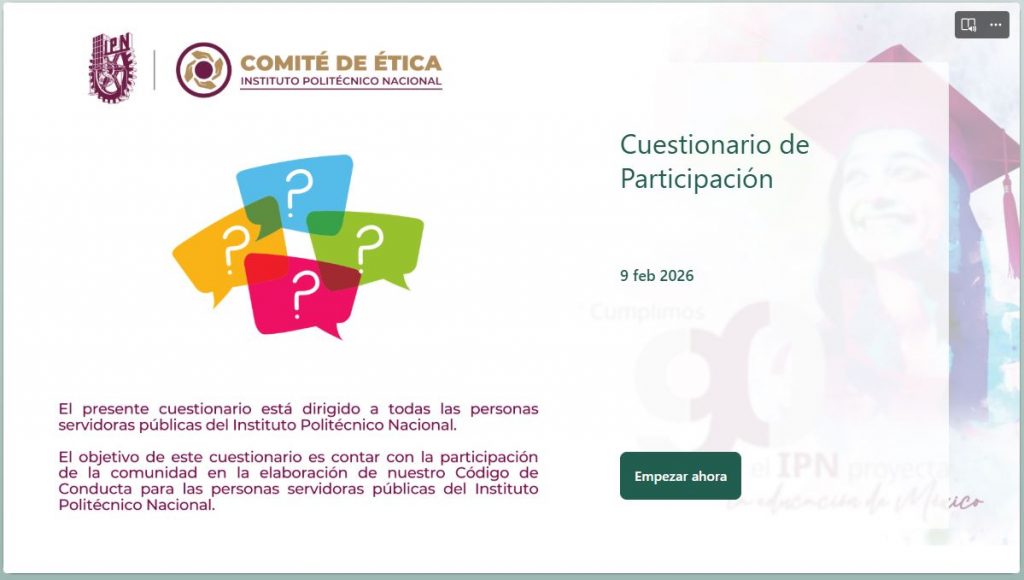 El Comité de Ética del Instituto Politécnico Nacional invita a todas las personas servidoras públicas a participar en un cuestionario electrónico con el propósito de recabar opiniones para mejorar y actualizar el Código de Conducta Institucional.