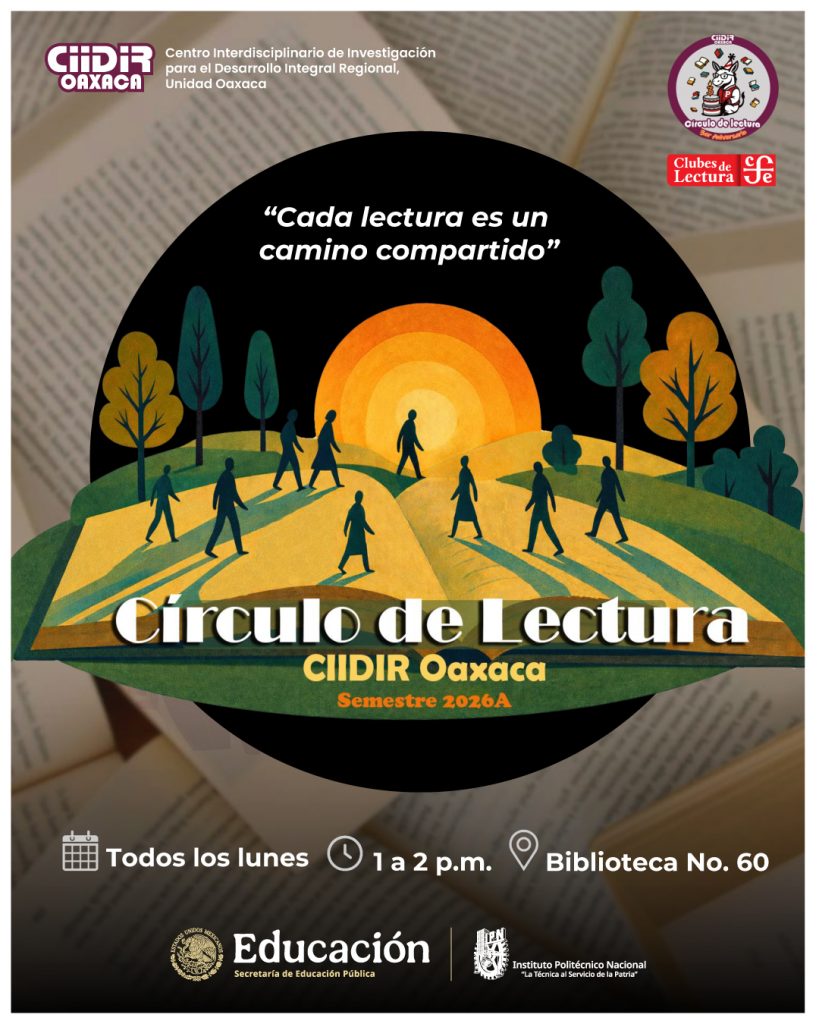 Se invita a la comunidad politécnica y público en general a participar en las sesiones del Círculo de Lectura (semestre 2026A), todos los lunes de 13:00 a 14:00 h, en la Biblioteca No. 60 del CIIDIR, Unidad Oaxaca.