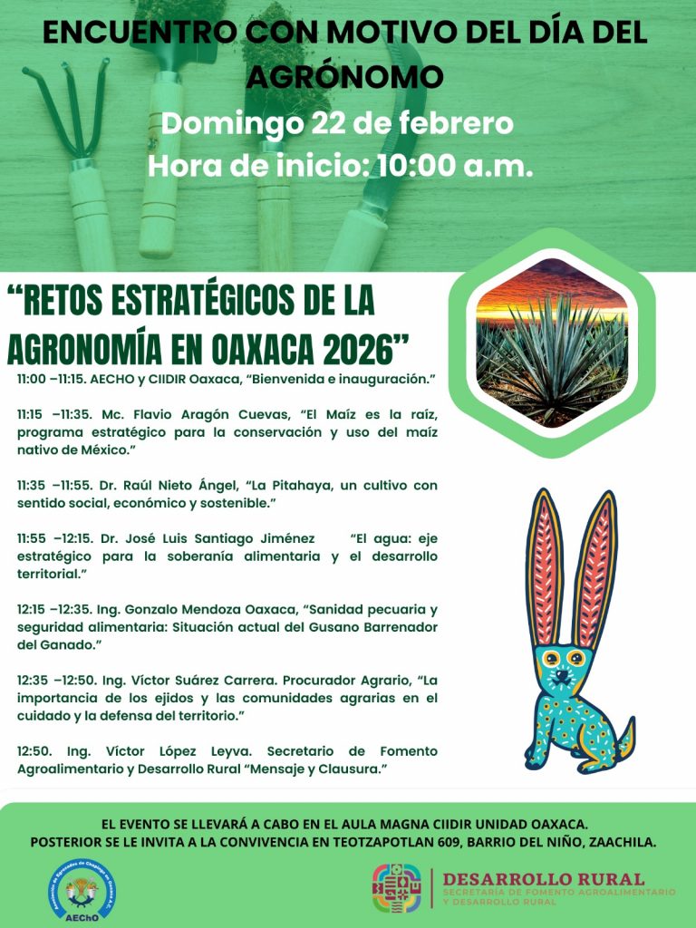 Se invita a las(los) Agrónomas(os) y comunidad politécnica en general, a participar en la celebración del día del Agrónomo, con la temática «Retos Estratégicos de la Agronomía en Oaxaca 2026». El evento se llevará a cabo en el Aula Magna del CIIDIR Unidad Oaxaca, el próximo domingo 22 de febrero de 2026, a partir de las 10:00 horas.