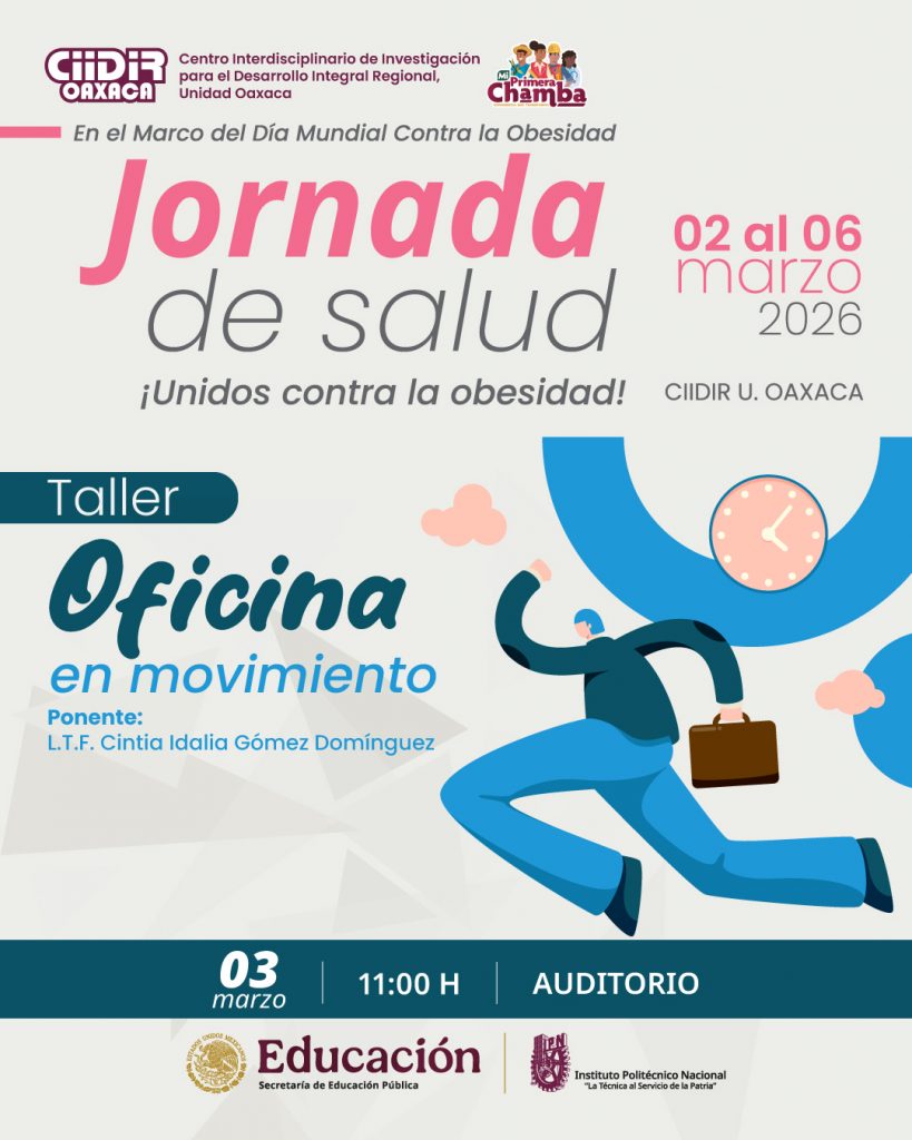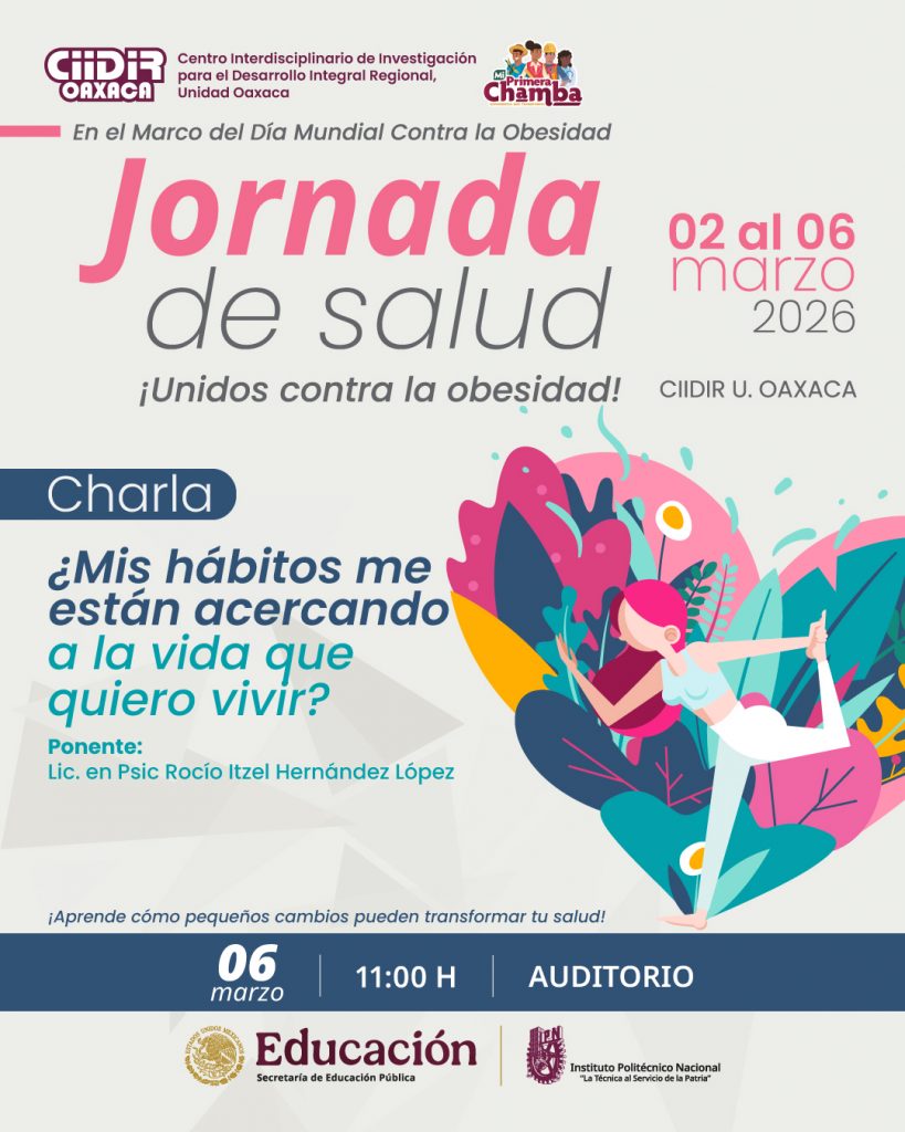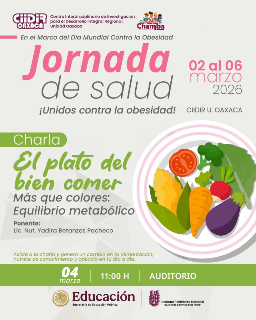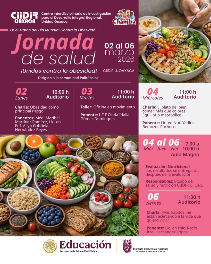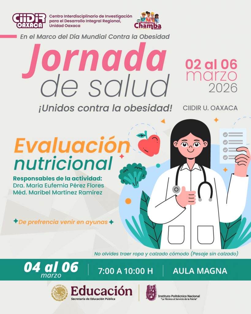 En el marco del Día Mundial contra la Obesidad y con el objetivo de fomentar una alimentación saludable como medida preventiva para la salud en la comunidad del CIIDIR Unidad Oaxaca, el equipo de Nutrición y Salud de este Centro, hace una atenta invitación a la comunidad politécnica para que asistan a la Jornada de Salud ¡Unidos contra la obesidad!
