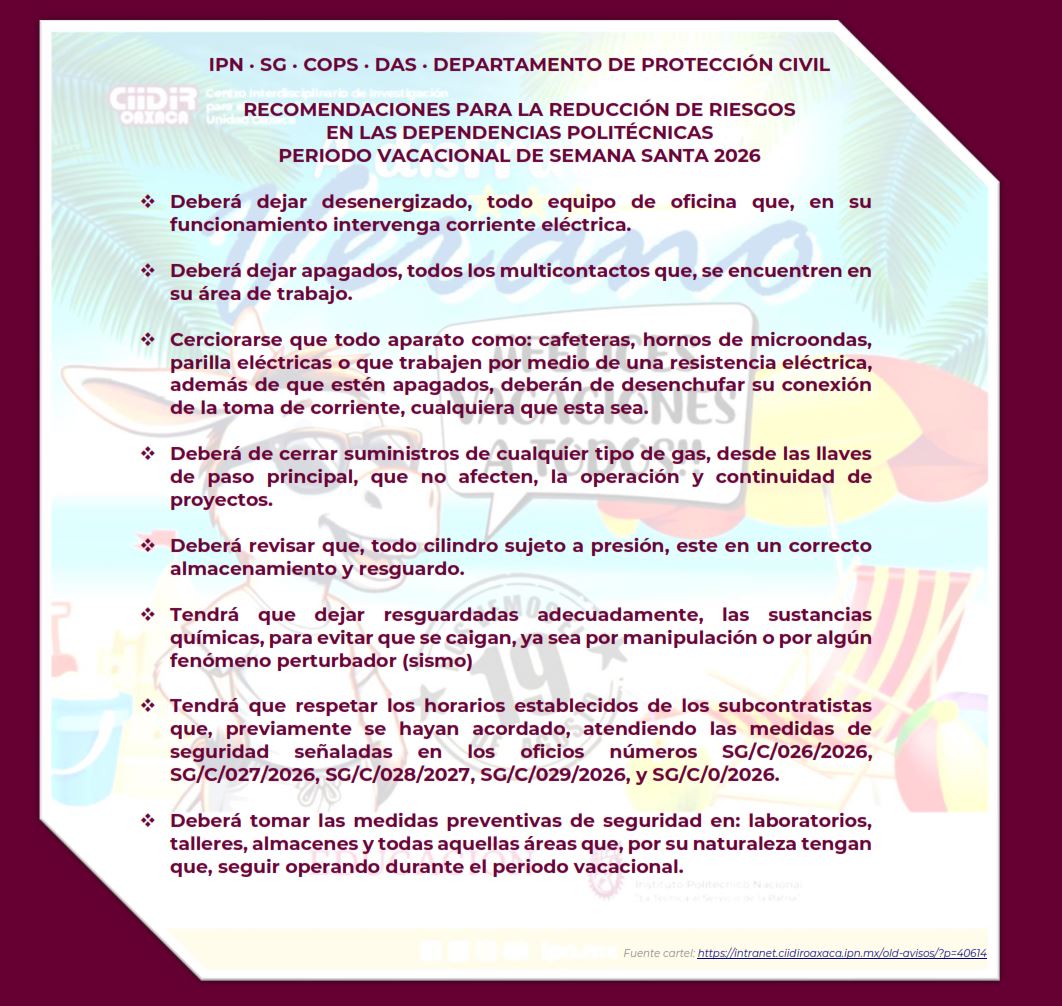 Por indicaciones del Departamento de Protección Civil (PDC) de la División de Apoyo y Seguridad, comparte oficio circular no. SG/C/0669/2026, signado por el Secretario General del IPN, con el objeto de reducir el riesgo de alguna eventualidad, en este periodo vacacional, comprendido del 28 de marzo al 12 de abril del presente año, establecido en el calendario oficial Institucional, compartiéndonos las recomendaciones de seguridad siguientes: