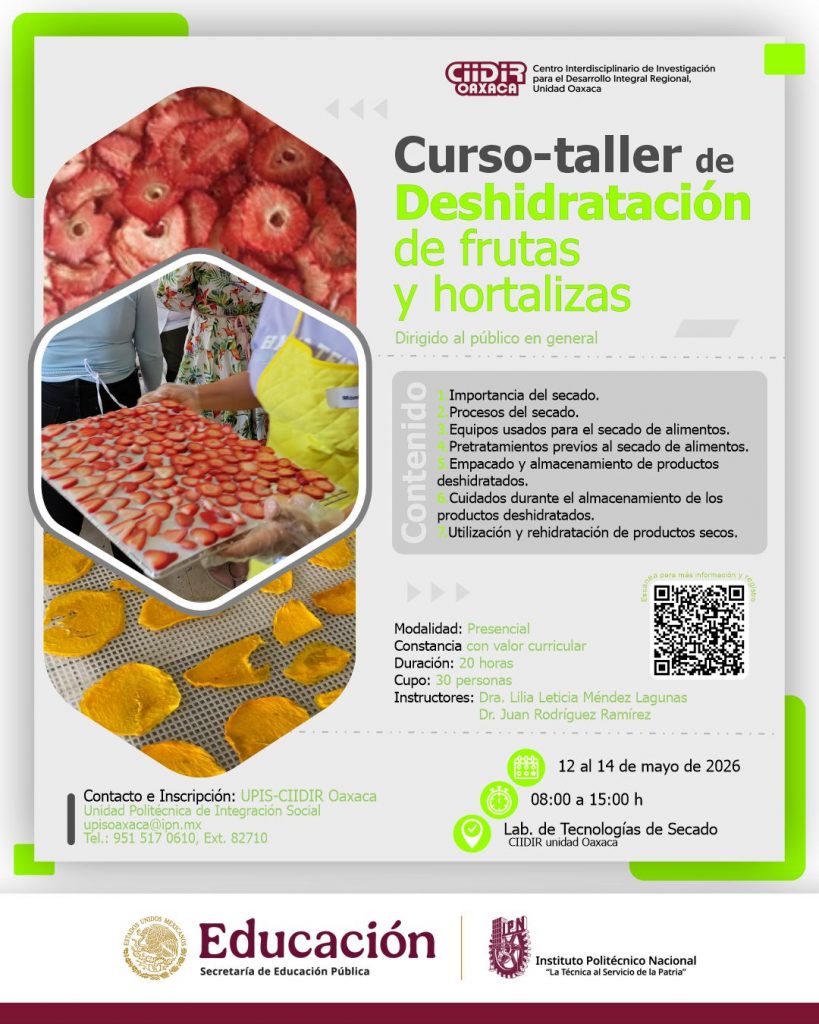 Para más información y registro ingresa a: https://www.ciidiroaxaca.ipn.mx/eventos/curso-taller-deshidratacion-de-frutas-y-hortalizas.html